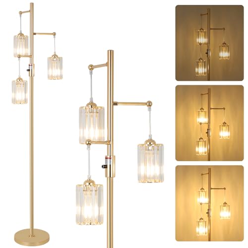 Rayofly Dimmable Floor Lamps for Living Room, 3-Lights Crystal Standing Lamps for Living Room, Gold Floor Lamp with Glass Lampshades, Modern Floor Lamp for Bedroom, Standard Tall Lamps for Office