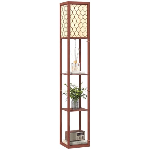 HOMCOM Floor Lamp with Shelves, Modern Tall Standing Lamps with Fabric Lampshade, Chain Switch and Single Light for Living Room, Bedroom, Bulb not Included, Brown