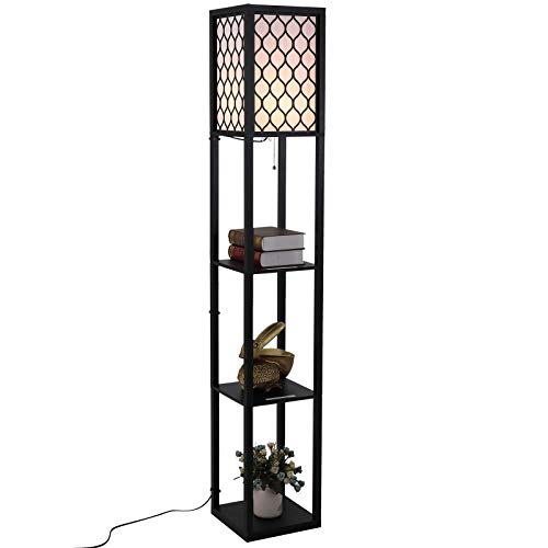 HOMCOM Floor Lamp with Shelves, Modern Tall Standing Lamps with Fabric Lampshade, Chain Switch and Single Light for Living Room, Bedroom, Bulb not Included, Black