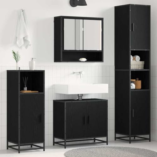 QJBSAVVA Bathroom Cabinet Set Black Oak 3 pcs Engineered Wood 64.5 x 33.5 x 59 cm Sink Mirror Tall Unit Slim Storage Modern Design for Compact Bathrooms