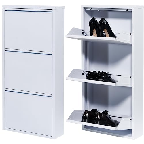 Atahome Slim Shoe Cabinet Narrow Shoe Storage Cabinet for hallway wall mounted thin flip down Tall Metal Shoe Rack Storage Organiser Shoe cupboard Indoor Assos 3-Drawer (White)
