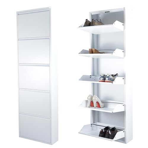 Atahome Slim Shoe Cabinet Tall Narrow Shoe Storage Cabinet for hallway wall mounted thin flip down Metal Shoe Rack Storage Organiser Shoe cupboard Indoor Lydia 5-Drawer Tier (White)