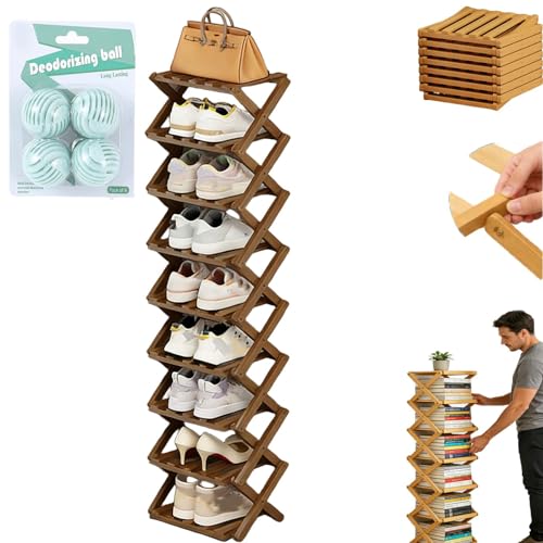 9-Tier Foldable Bamboo Shoe Rack, No-Assembly Vertical Slim Shoe Organizer, Tall Narrow Space-Saving Shoe Shelf for Entryway, Closet & Dorm (Brown,8 Tiers)