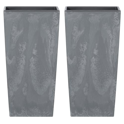 URBNLIVING Tall Short Grey Concrete Effect Flower Plant Pot Indoor Outdoor Garden Planters (2, Tall Square)
