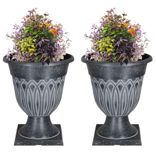 Worth Garden Plastic Urn Planters for Outdoor Plants, Tree 22'' Tall 2 Pack Round Classic Resin Flower Pots Indoor Beige Traditional Front Porch 15 in Dia. Large Imitation Stone Decorative Patio Deck