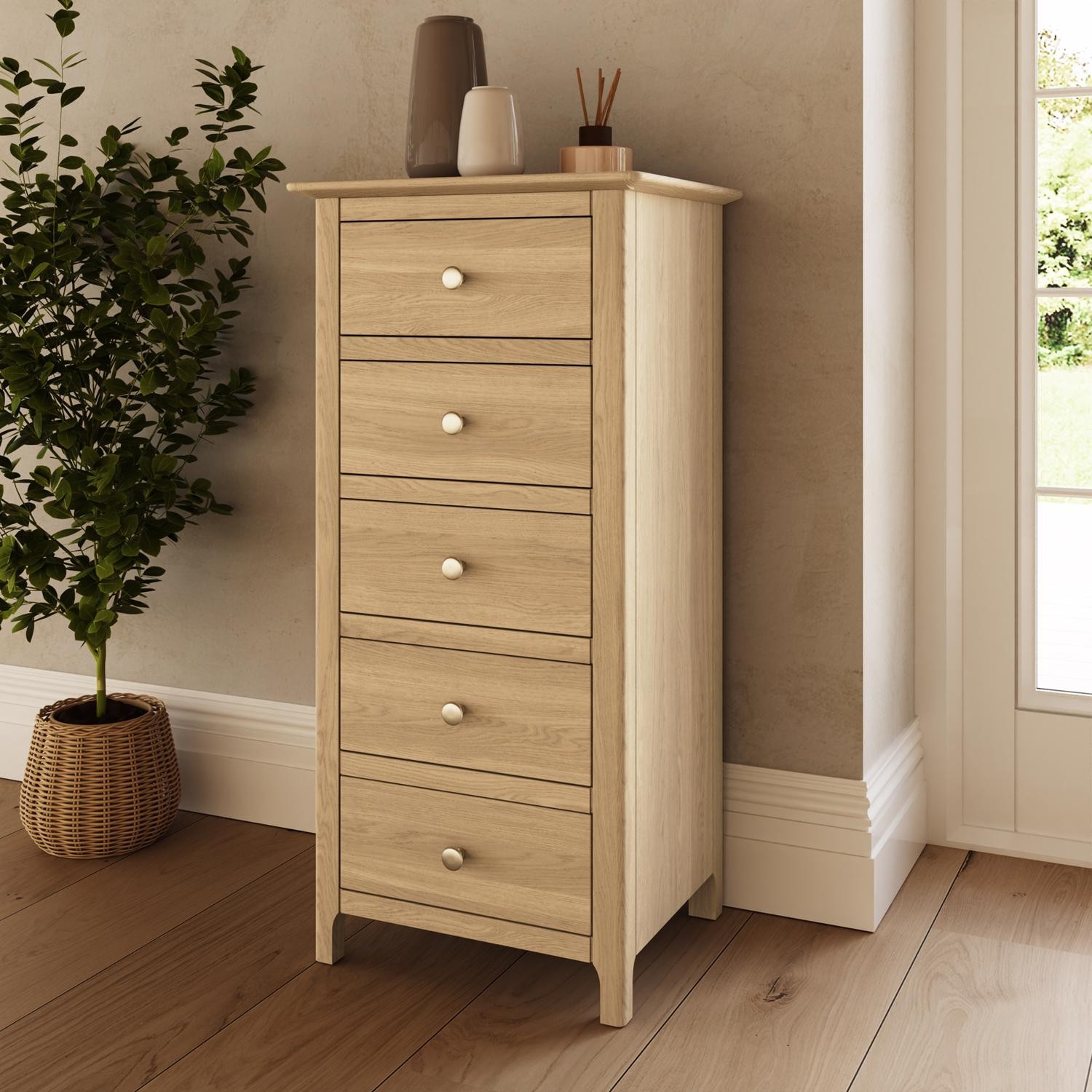 5 Drawer Chest of Drawers Tall Slim Natural Oak Finish Bedroom Storage Unit