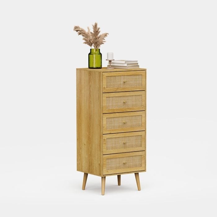 VonHaus Tall Chest of Drawers - Scandi Style 5 Drawer Natural Rattan Slim Set of Drawers with Metal Handle and Tapered Legs - Boho Look Tall Boy Storage for Bedroom, Cane Narrow Cabinet