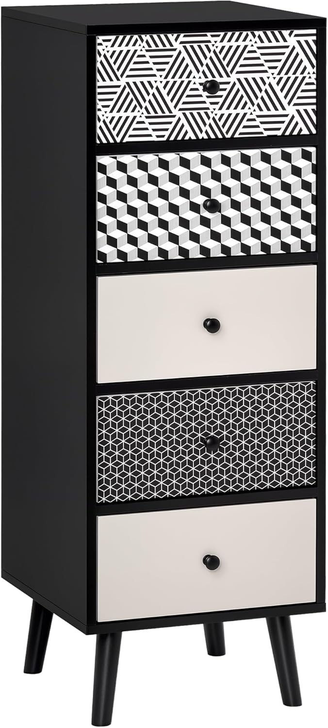 Chest of 5 Drawers Tall Slim Cabinet Bedroom Dresser Living Room Black Geometric