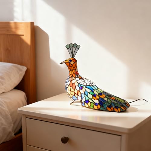 MUOKGFR Retro Stained Glass Blue Peacock Night Light 11 Inch Tall Tiffany Style Table Lamp for Bedroom Nightstand Dining Room Nursery Office Home Decoration