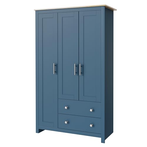 Nera 3 Door Wardrobe with Drawers Shelves and Hanging Rail Tall Wardrobes for Bedrooms Storage (Navy on Oak)
