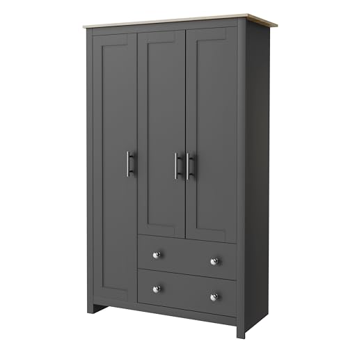 Nera 3 Door Wardrobe with Shelves and Hanging Rail Tall Wardrobes for Bedrooms Storage (Grey on Oak)