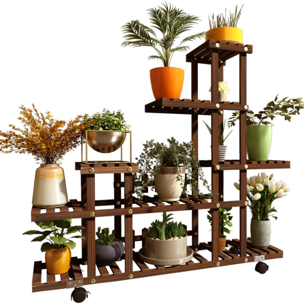 Wood Plant Stand with Wheels, Tall Wooden Multitier Shelf for Indoor Outdoor Use, SpaceSaving Brown Rack