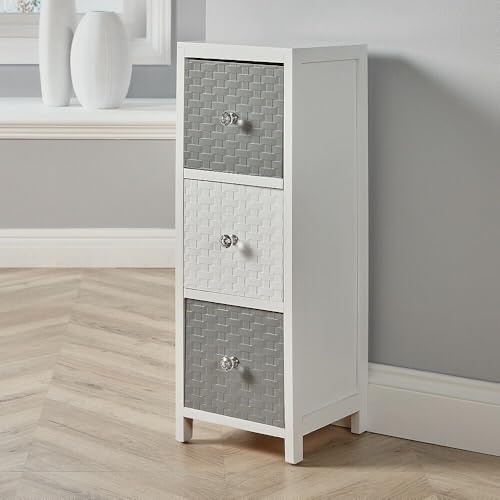 Home Source Chest of Drawers, Wooden Tallboy Storage, Bedroom Bathroom Organiser, Crystal Handles, White and Grey, 3 Drawer