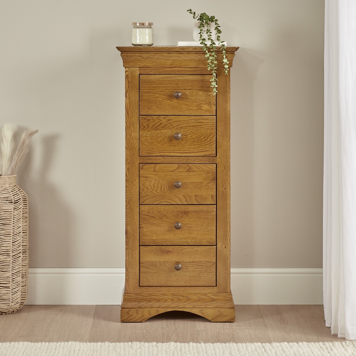 The Furniture Market French Louis Oak 5 Drawer Tallboy Wellington Chest of Drawers – Elegant French Styling with Ample Storage and Satin Lacquered Finish - H 1200 x W 540 x D 390mm