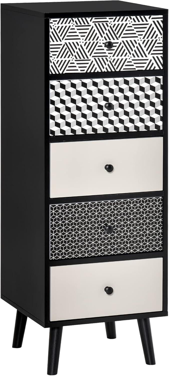 5 Drawer Tallboy White Black Geometric Pattern Tall Chest of Drawers Wooden Unit