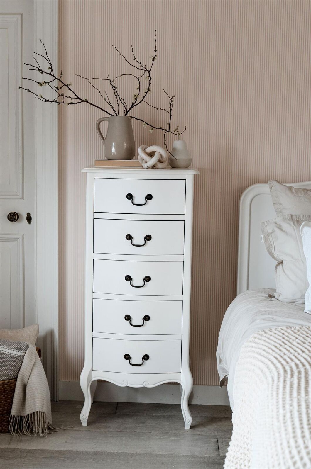 Juliette Tallboy White French 5 Drawer Narrow Chest of Drawers FULLY ASSEMBLED