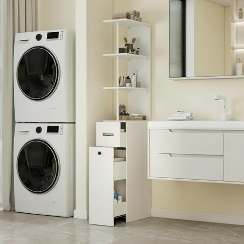 Saxony® Bathroom Storage Cabinet corner unit with 2 open Shelves 1 Door and 3 Drawers Tallboy Storage Unit Wooden Furniture Tall Narrow Cupboard Slim Floor Cabinets Standing Design White