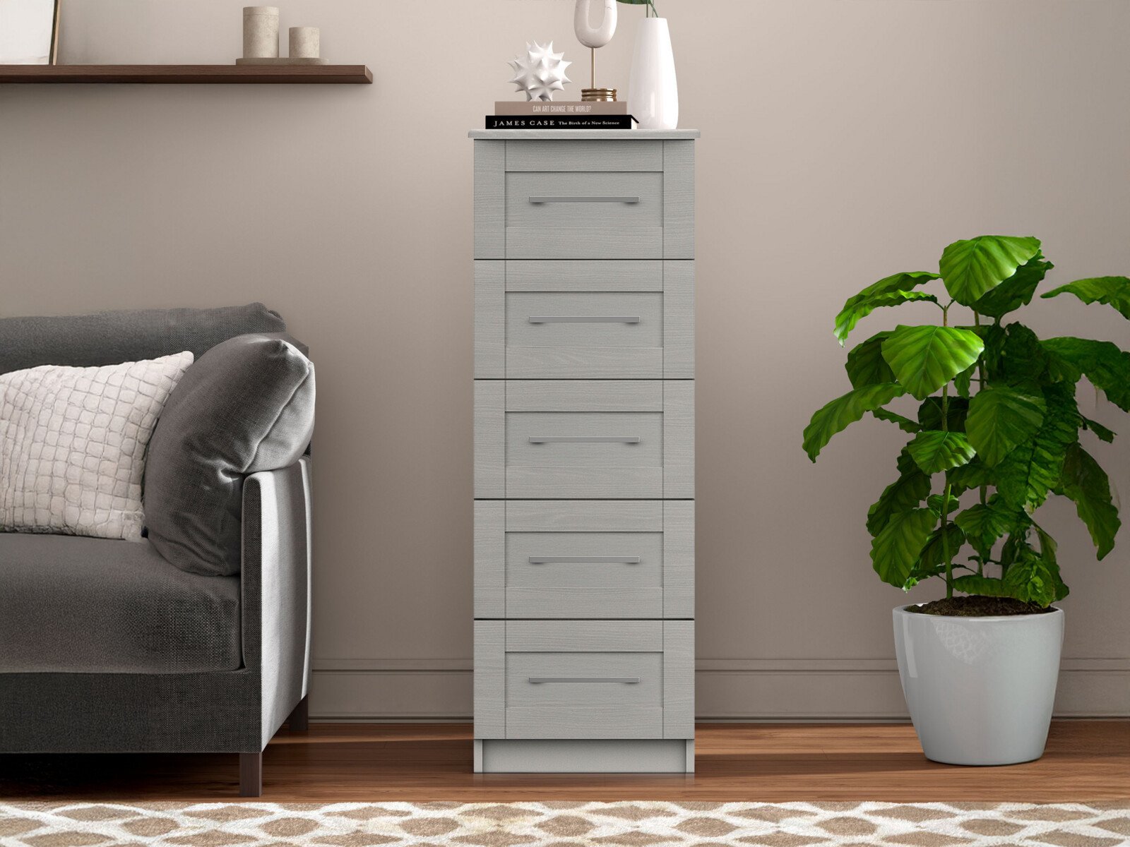 RoselandFurniture Farro Grey Tallboy Chest of Drawers for Bedroom Slim 5 Drawer Cabinet Fully Assembled Contemporary Tall Painted Solid Wood Narrow Storage Chest with Oak Top | 115 x 45cm