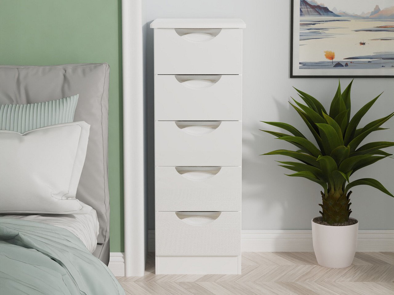 GROF Premium Chest of Drawer Slim Tallboy, 5 Drawer Tall Chest, Painted Bedroom Furniture, Painted White Tallboy Chest of Drawers for Bedroom, Fully assembled (White, W48cm - D40cm - H120cm)