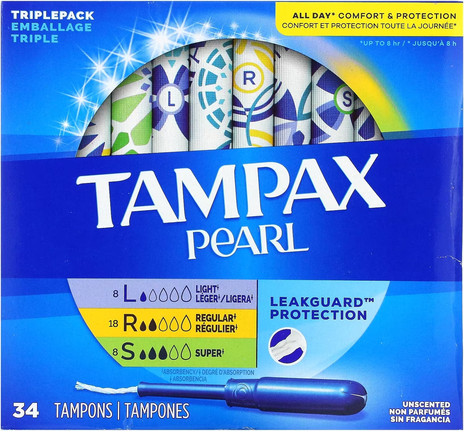 TAMPAX Pearl Tampons Trio Pack, Super/Super Plus/Ultra Absorbency with BPA-Free Plastic Applicator and LeakGuard Braid, Unscented, 34 Count