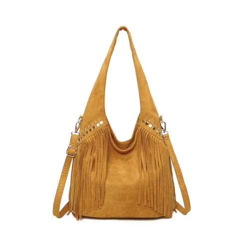 Lusso in pelle Genuine Italian Suede Tassel Handbag Crossbody Bag with Adjustable Detachable Straps (Tan)