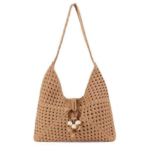 Rejolly Crochet Hobo Bag for Women Summer Vacation Beach Tote Handbags Boho Bohemian Ethnic Authentic Style Shoulder Purse Tan