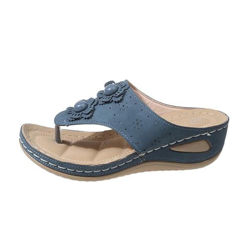 Cbebvwl Womens Sandles Women's Sandals Ladies Running Trainers Tan for Women White Flower Crochet T-Bar Sandal Orthopedic Wide Fit Dressy Wedge Shoes UK Sliders Office D-Blue Size 4.5