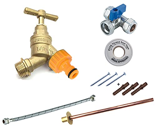 Pipestation® Complete Outside Tap Kit Garden Hose Fitting Set Tap + Wallplate Tube + PTFE + Connector +Flex+ Isolator Full kit