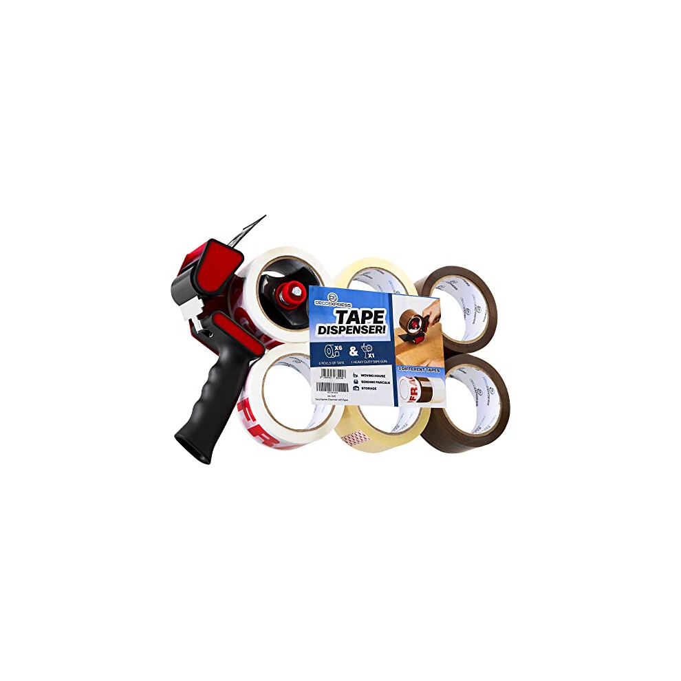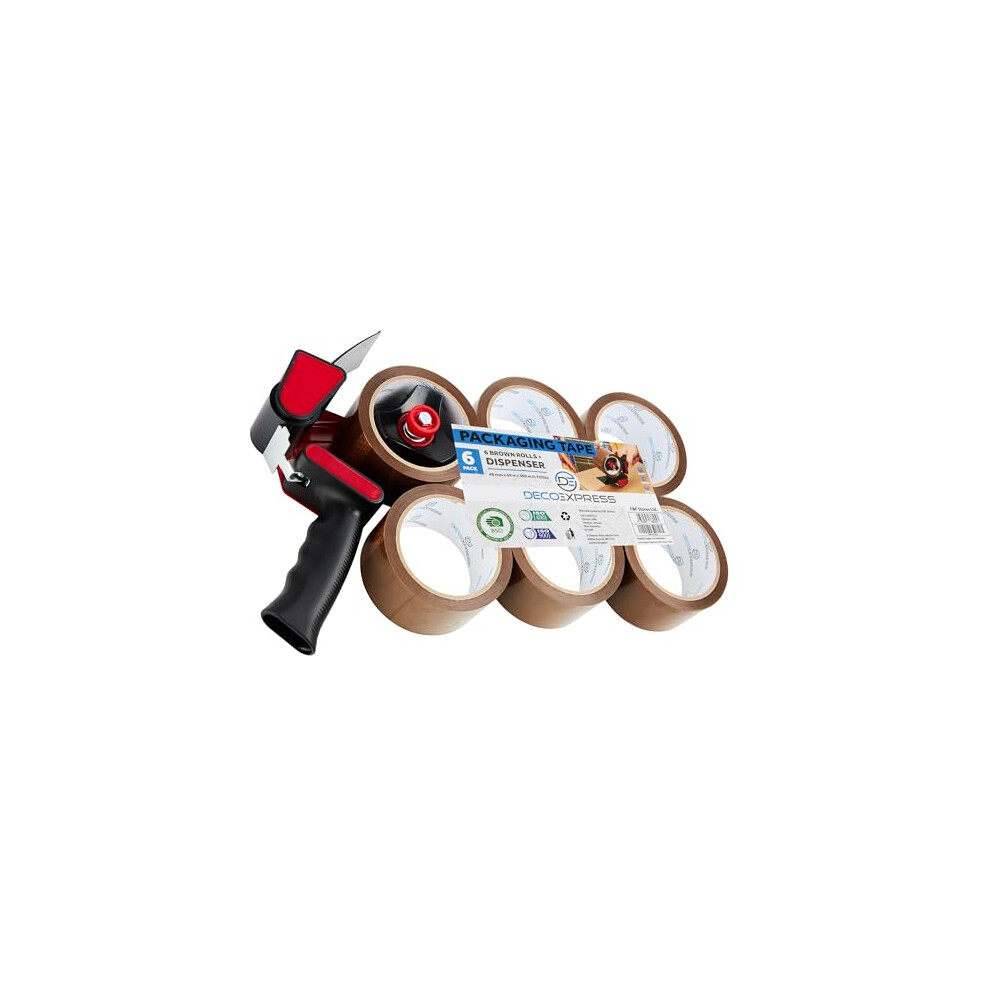 DECO EXPRESS Packaging Tape Dispenser Gun and 6 Rolls Parcel Tape Strong Brown Fragile Clear Heavy Duty for Packing Boxes Moving House Essentials (Dispenser Brown, 1 Pack)