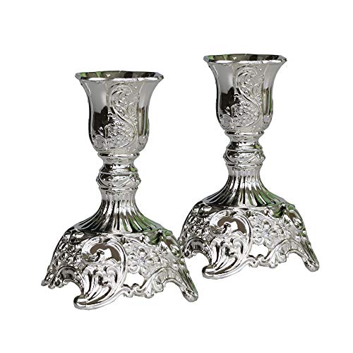 Taper Candle Holders With Deluxe Engraved Design, Set of 2 Premium Metal Silver Candlestick Holders