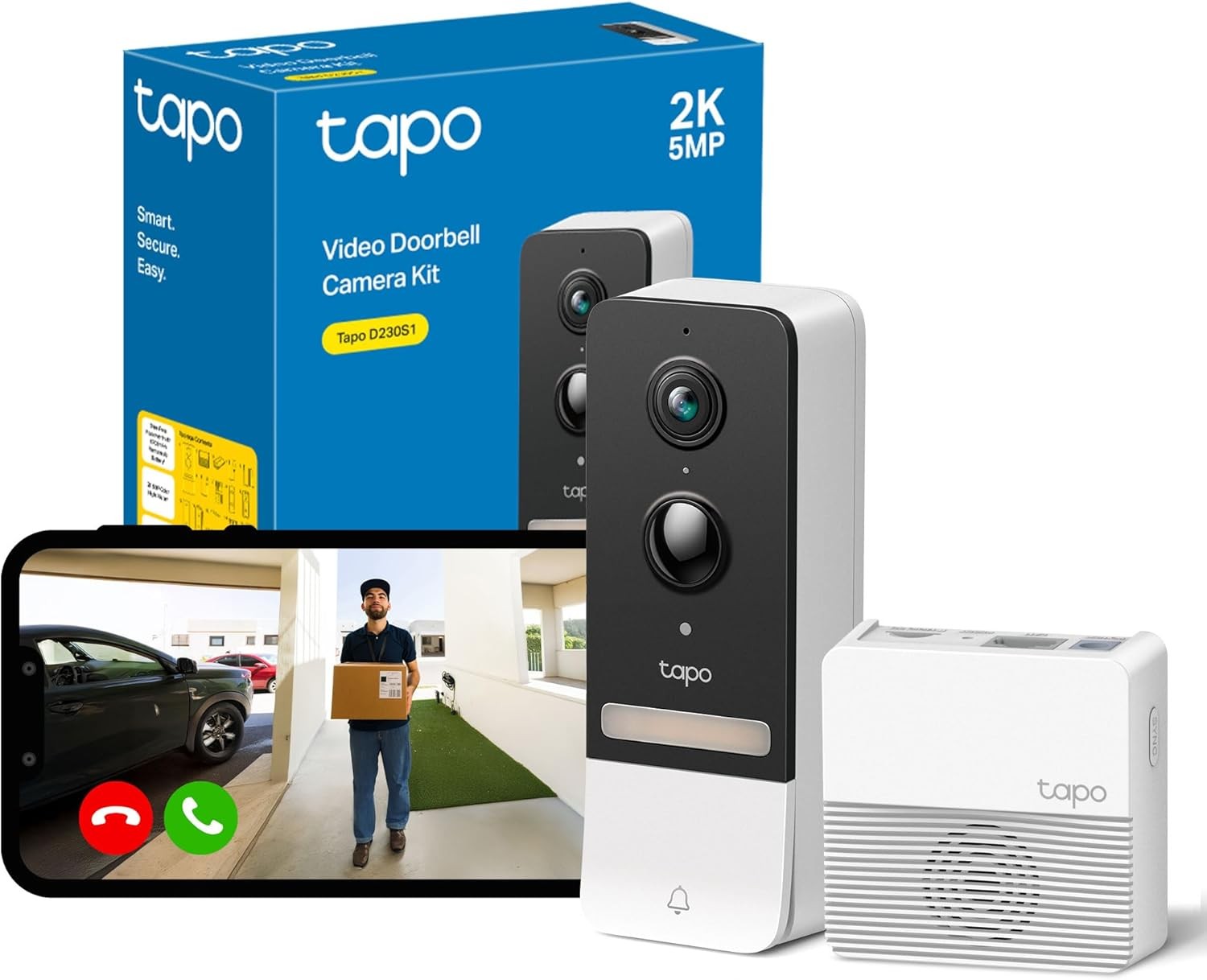 Tapo D230S1 2K 5MP Battery Video Doorbell Wireless, Security Camera Doorbell, Ring Chime Included, Color Night Vision, Head-to-Toe View, 6-Month Battery, IP64, Cloud &Local Storage, No Monthly Fee