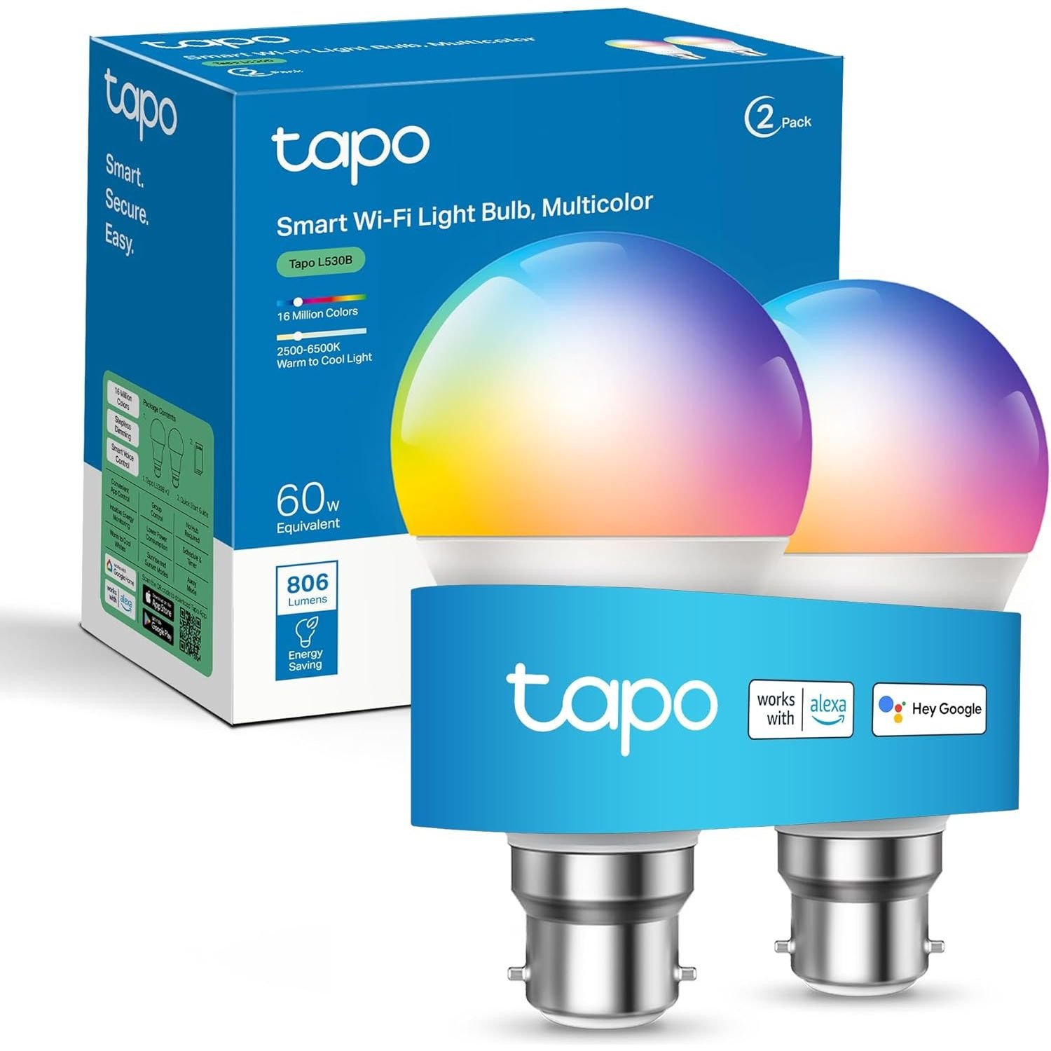 Tapo Smart Bulb B22 (2-Pack) – Multicolour, 60W Energy-Saving, Works with Alexa & Google Home, No Hub Required (Tapo L530B) [Energy Class F] - New