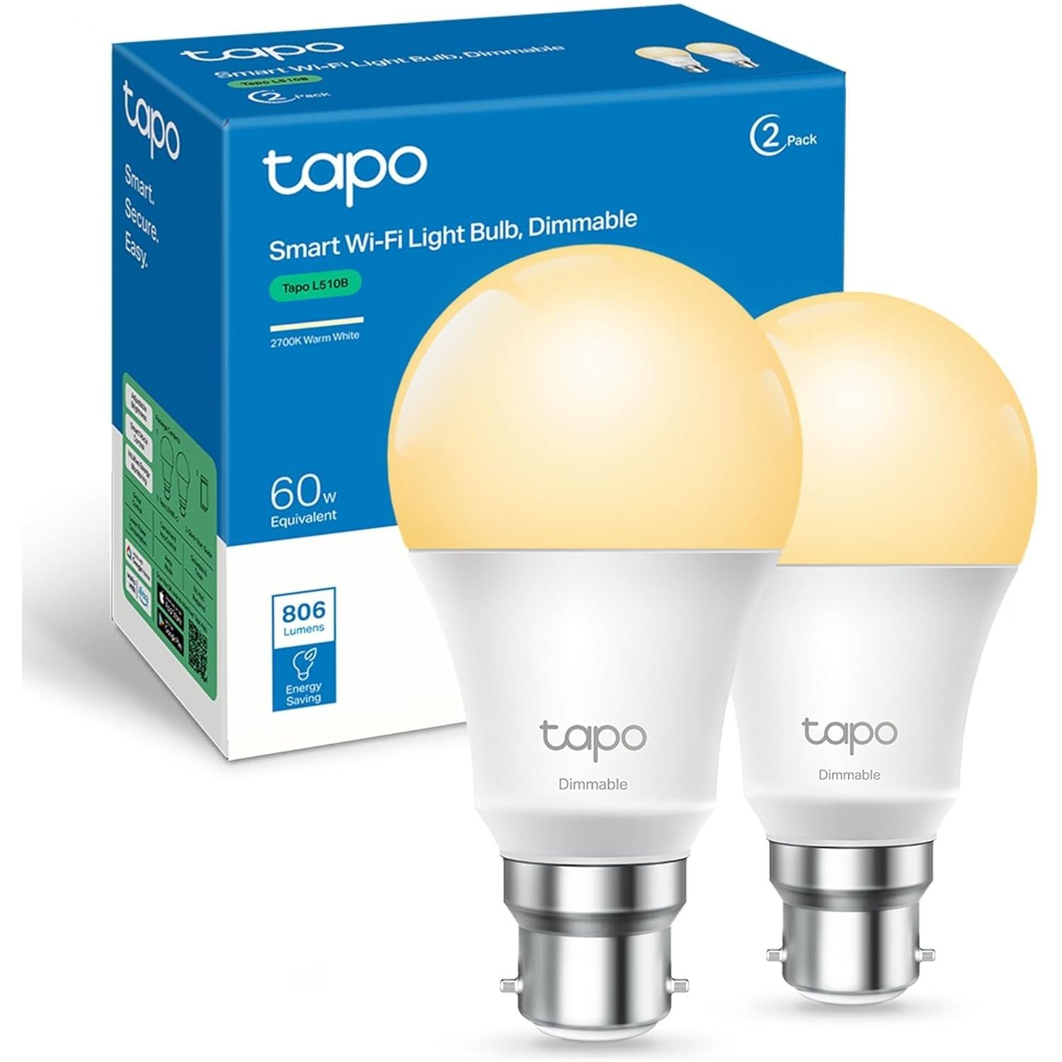 Tapo L510B (2-Pack) B22 Smart Bulb, Alexa Light Bulb, WiFi Smart Light Bulb, Dimmable, 8.3W (60W), Schedule & Timer, Away Mode, Energy Saving, Preset