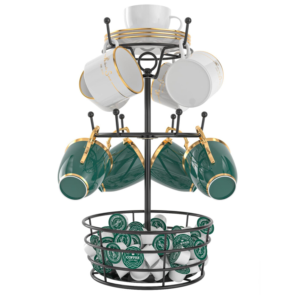 Visentor Coffee Mug Holder Tree Stand - Rotatable Metal Coffee Mug Rack Holder 3 Tiers Handle Coffee Cup Holder for 10 Mug Hooks with Cup Pods & Sauc