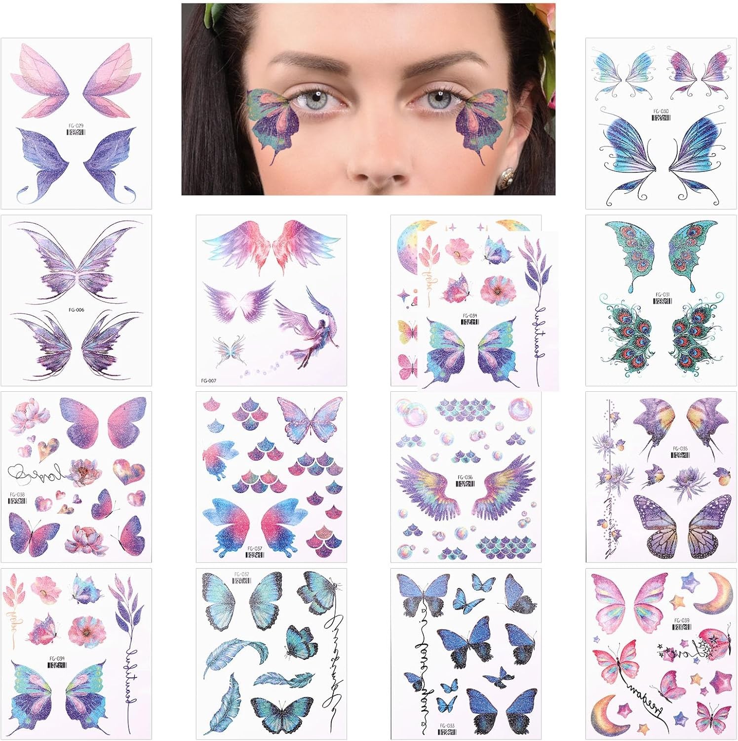 14 Sheets Glitter Butterfly Tattoos Temporary Stickers Waterproof Butterfly Fac