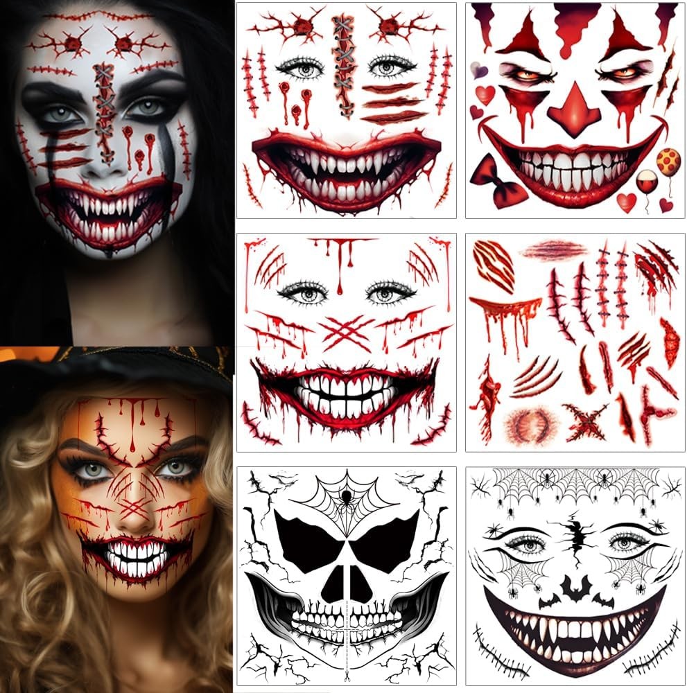 COKTAK 4 Sheet Scary Halloween Face Tattoos For Women Men Adults, Fake Wound Sc