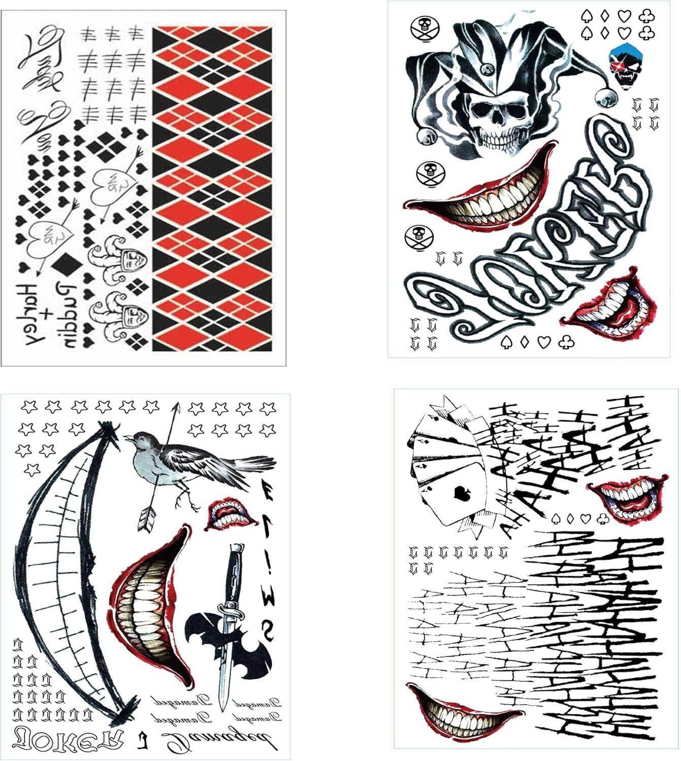 4 Sheets 3D Joker Temporary Tattoos for Men & Women, Halloween Makeup Stickers,