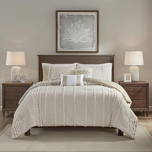 Madison Park Queen Comforter Set, Southwestern Boho Comforters Queen Bedding Reversible Seersucker Design, All Season, Soft Microfiber Queen Size Comforters, Fraser, Full/Queen Taupe/Blue 5 Piece
