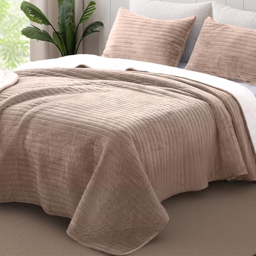SHALALA Velvet Quilt Queen Size,Striped Bedding Set,Lightweight Velvet Comforter,Luxurious Suede Bedspread and Coverlet with Soft Brushed Microfiber Back for All Season(Light Taupe,Full/Queen)
