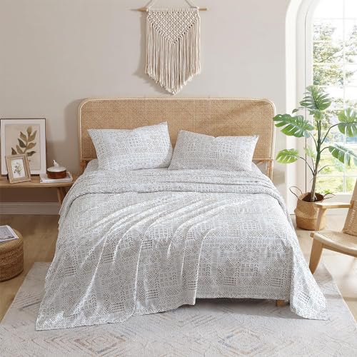 Indigo Ink - Queen Size Sheet Set, 4-Piece Boho Geometric Patterned Bedding, Soft & Wrinkle Resistant (White Denim Collection, Taupe)