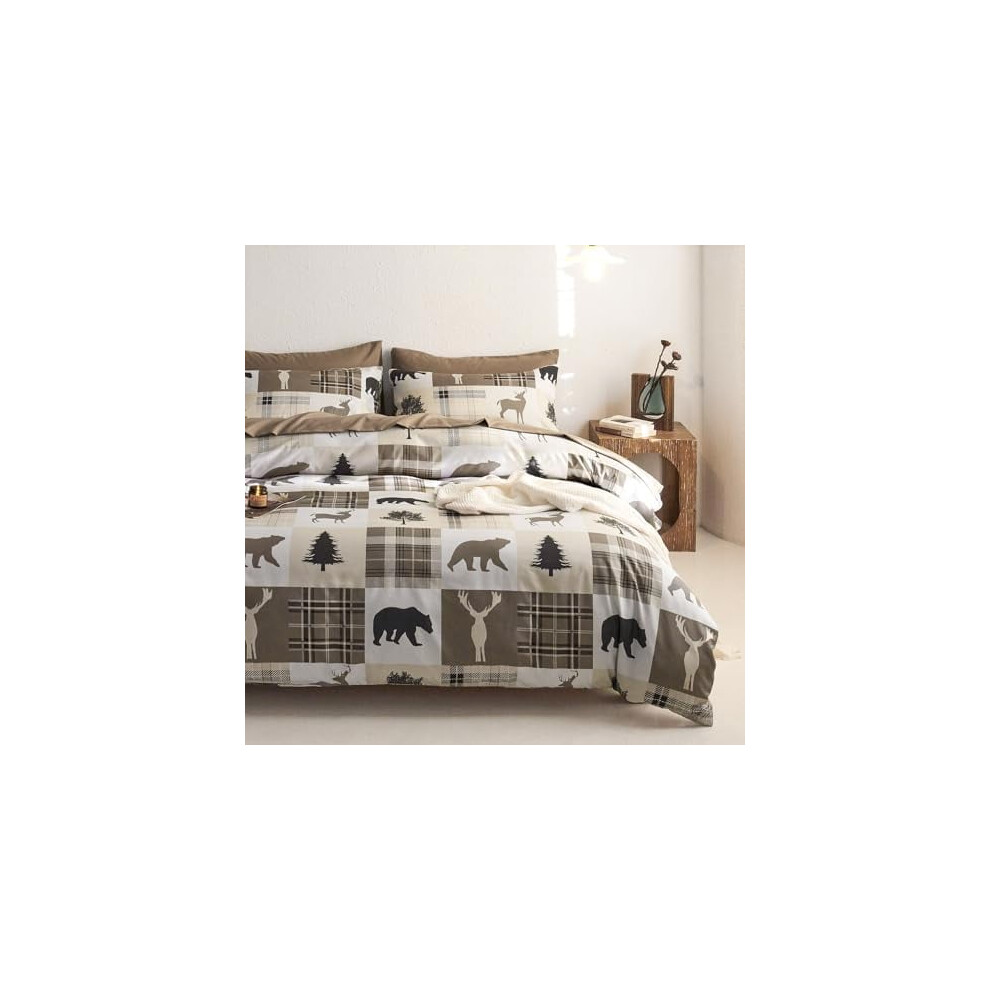 Rustic Duvet Cover Set, Cabin Christmas Lodge Theme with Bear & Deer, Soft Lightweight 3-Piece Bedding, Taupe Brown, King Size