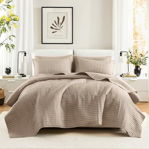 Luxlovery Beige Comforter Set King Light Khaki Bedding Set Oatmeal Light Taupe Blanket Quilts 3 PCS Comforter Cream Beige King Size Comforter Set Women Men