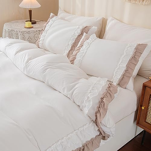Herside White Taupe Ruffle Duvet Cover Single Boho Bedding 2 Layers Ruffle Design Soft Farmhouse Bedding Sets 1 Duvet Cover 1 Pillowcase (White-Taupe, Single)
