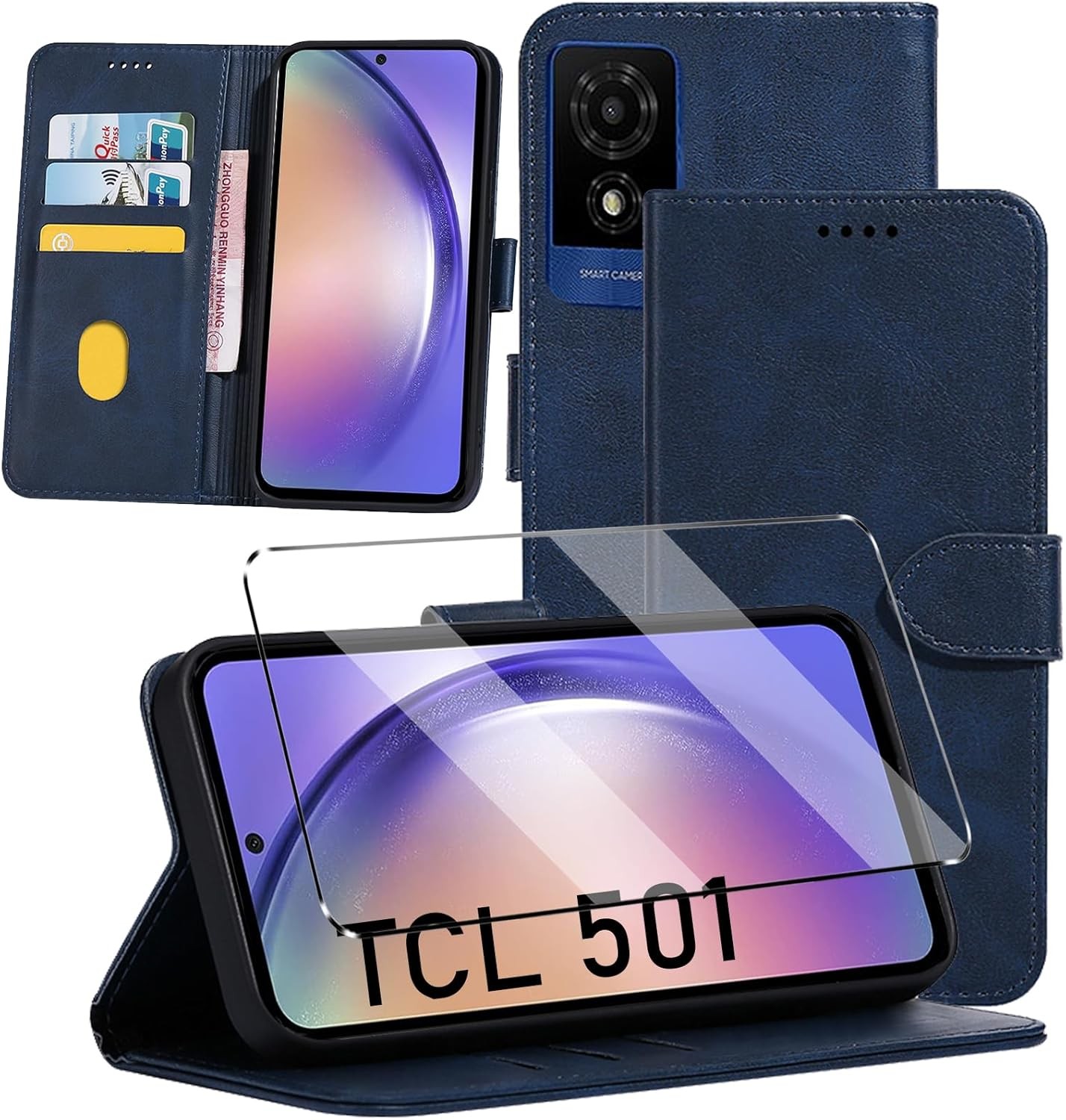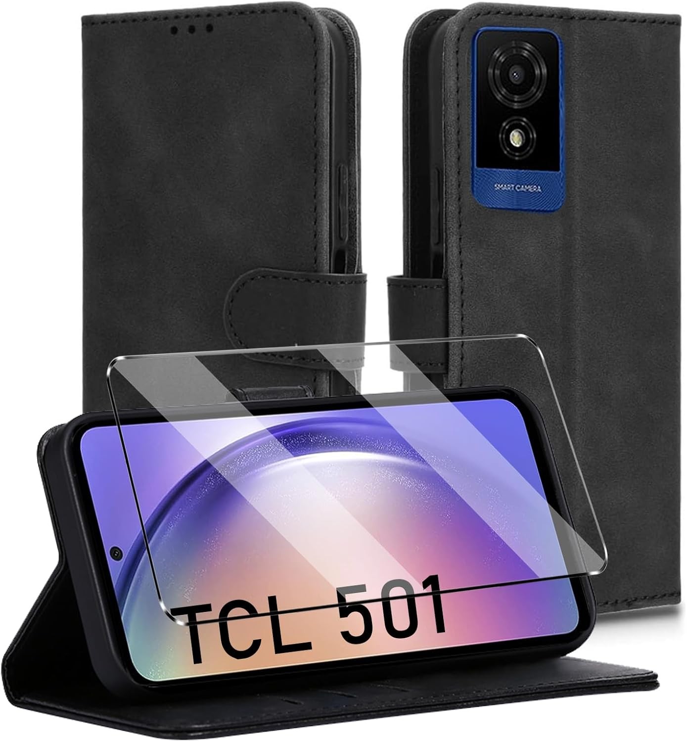for TCL 501 Case and 1 Tempered Glass Screen Protector, Leather Wallet Phone Ca
