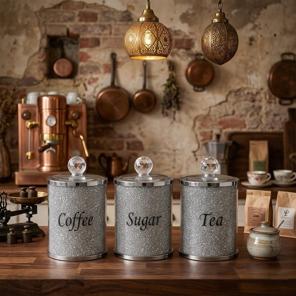 Silver Crystal Crushed Diamond Tea Coffee Sugar Canisters Jars | Kitchen Storage