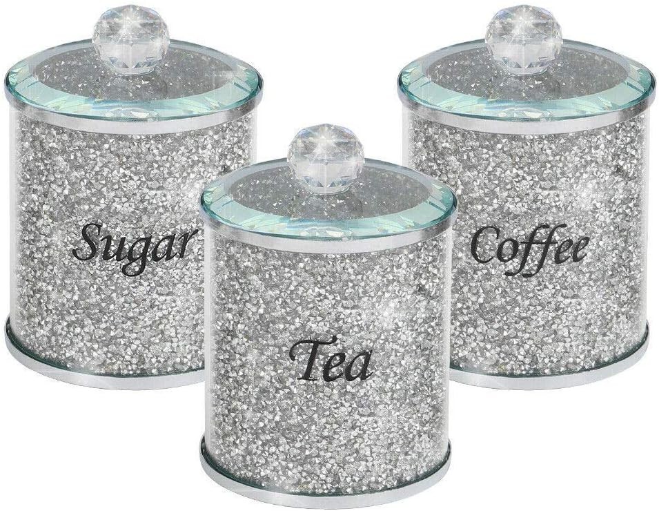 3pc Crushed Diamond Tea Coffee Sugar Jars Silver Diamante Glass Kitchen Canister