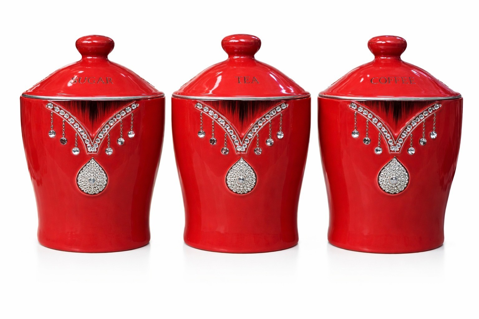 Set of 3 Red Ceramic Canisters Tea, Coffee, Sugar Jars Diamante Storage 17x13cm