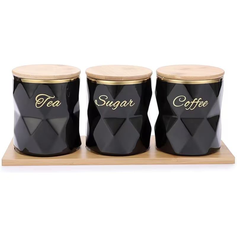 Luxury Black Ceramic Canisters Set of 3 with Wooden Stand-Tea, Coffee&Sugar Jars