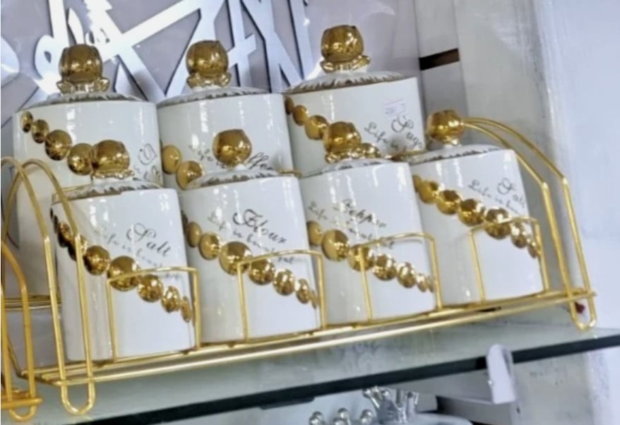 CANISTER SET OF 7 WITH STAND CERAMIC COFFEE TEA SUGAR SPICES JARS LUXURY GIFT