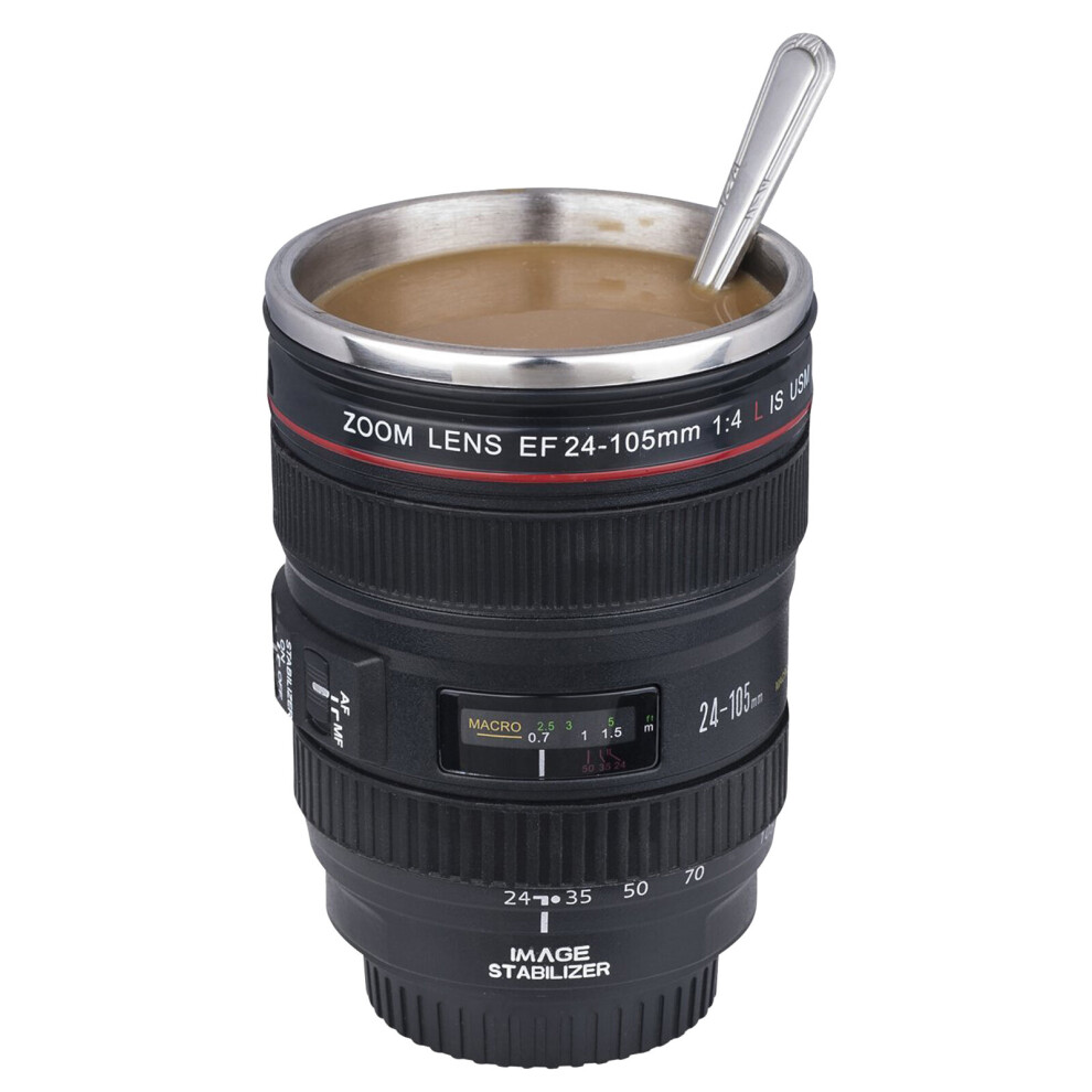 Camera Lens Mug Coffee Tea Stainless Steel Travel Cup Thermos Flask Sipping Lid